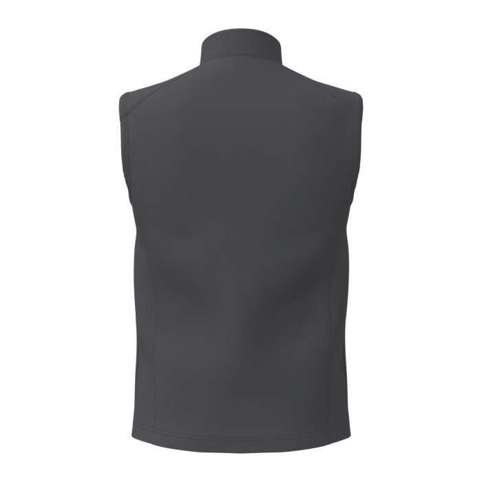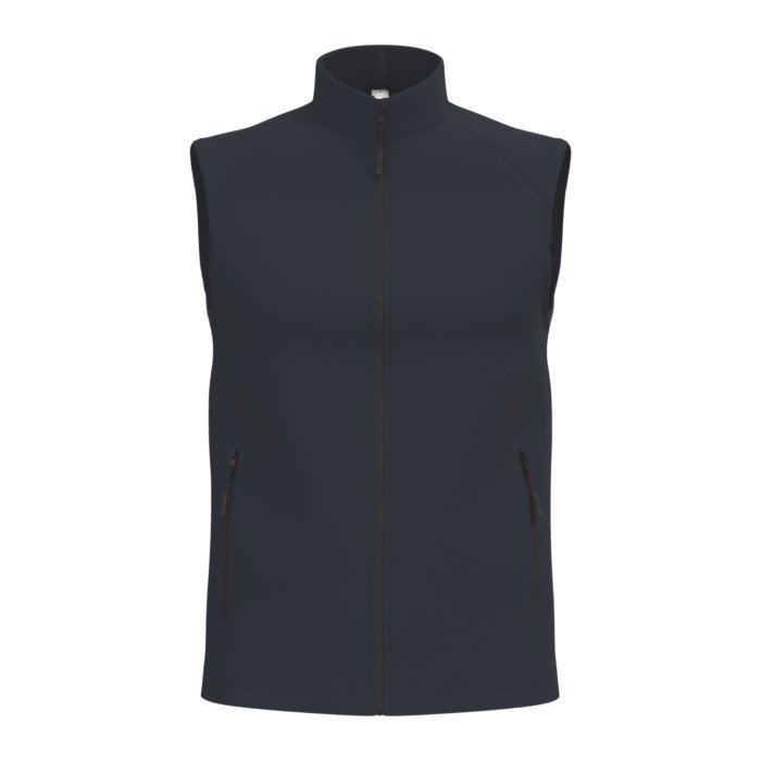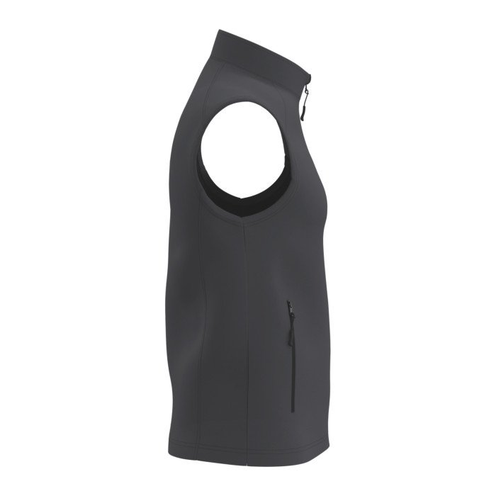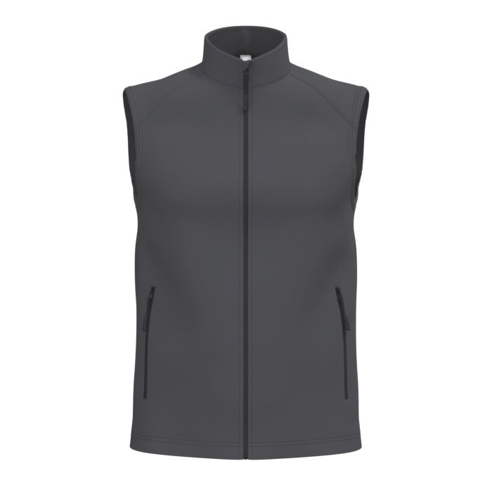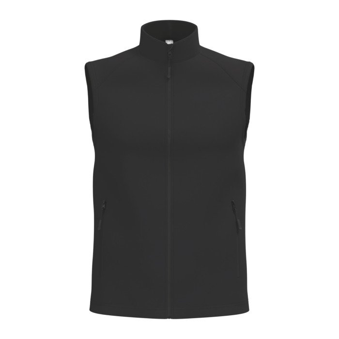En savoir plus | Gilet softshell déperlant sans manches en polyester/elasthanne pour femme ou homme, col montant, avec deux poches côtés doublées en polytricot, avec zips en nylon et tire-zips noirs.