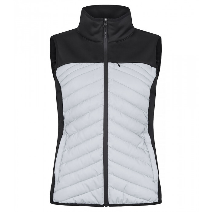 | En savoir plus | Gilet de travail sans manches en 100% polyester pour femme, col montant, avec deux poches basses et une poche poitrine smartphone system.