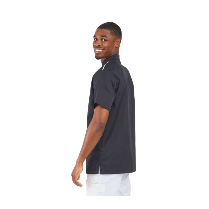 | En savoir plus | Blouse coupe mode manches courtes en coton/polyester recyclé/stretch pour homme, col officier, avec deux poches basses et une poche poitrine.