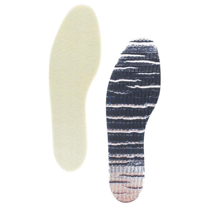 | Matière | Matière : feutre 100% laine naturelle en contact avec le pied. Couche en mousse polyéthylène à cellules fermées. Film aluminisé antidérapant au contact de la chaussure |
