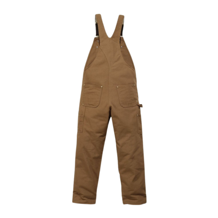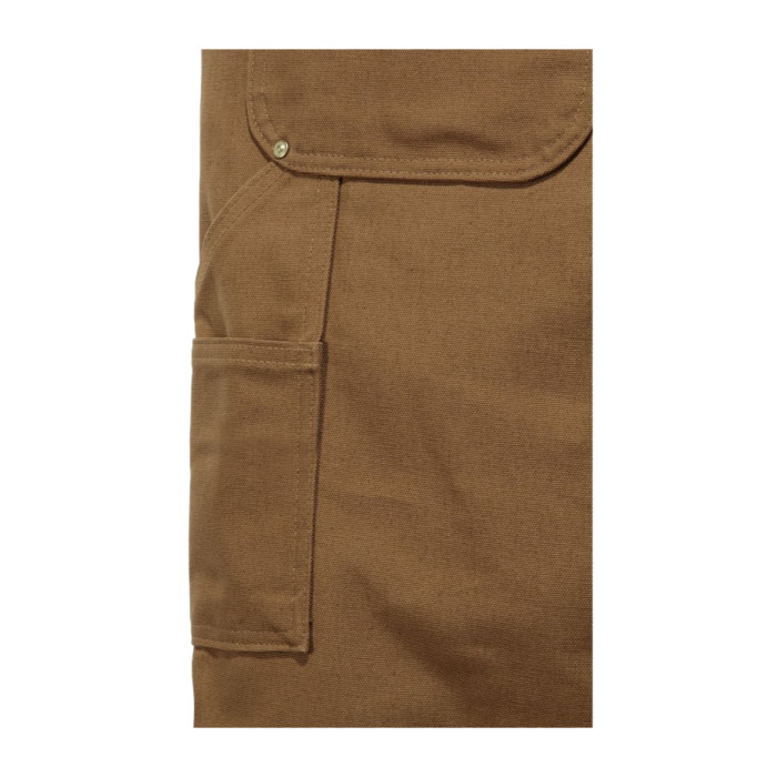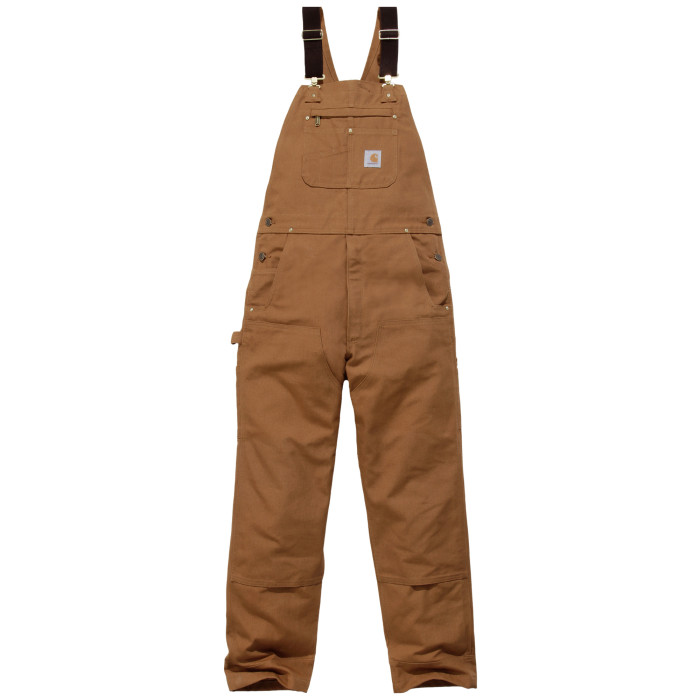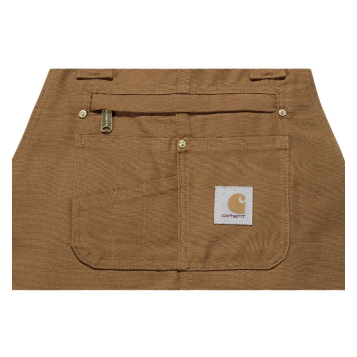 | En savoir plus | Salopette de travail traditionnelle en 100% coton pour homme, avec poche bavette multiples compartiments plaquée rivetée et zip, deux grandes poches avant plaquées rivetées, poche ticket plaquée rivetée, deux poches arrière plaquées rivetées avec étiquette carhartt® cousue côté droit, boucle marteau côté droit et poches outils jambe gauche.
