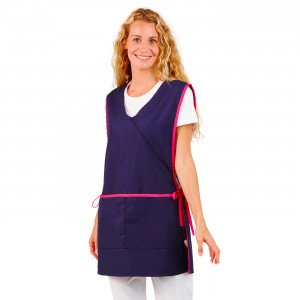 Chasuble de travail en polyester/coton pour femme, col V, avec deux poches basses et une poche poitrine avec biais imprimés. Une touche de féminité originale pour cette chasuble très pratique et fantaisie.