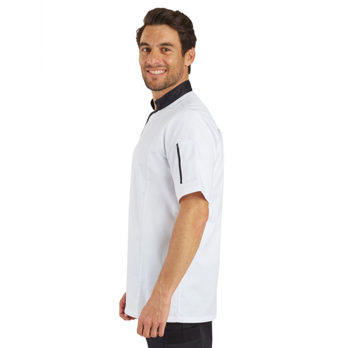 | En savoir plus | Veste de cuisine manches courtes en polyester/coton pour homme, col officier, avec une poche plaquée stylo sur la manche gauche.
